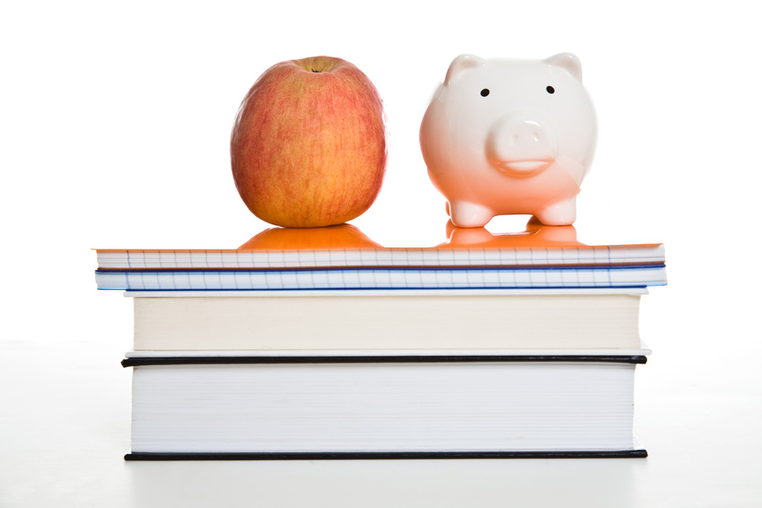 A shot of an apple and a piggy bank on top of books, can be used for education concept