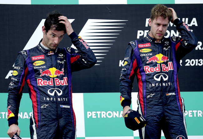 epa03639182 Australian Formula One driver Mark Webber (L) of Red Bull Racing with his teamates German Sebastian Vettel on podium after win the Malaysian Formula one Grand Prix at Sepang International Circuit of Malaysia Formula one Grand Prix, near Kuala Lumpur, Malaysia, 24 March 2013. EPA/AHMAD YUSNI